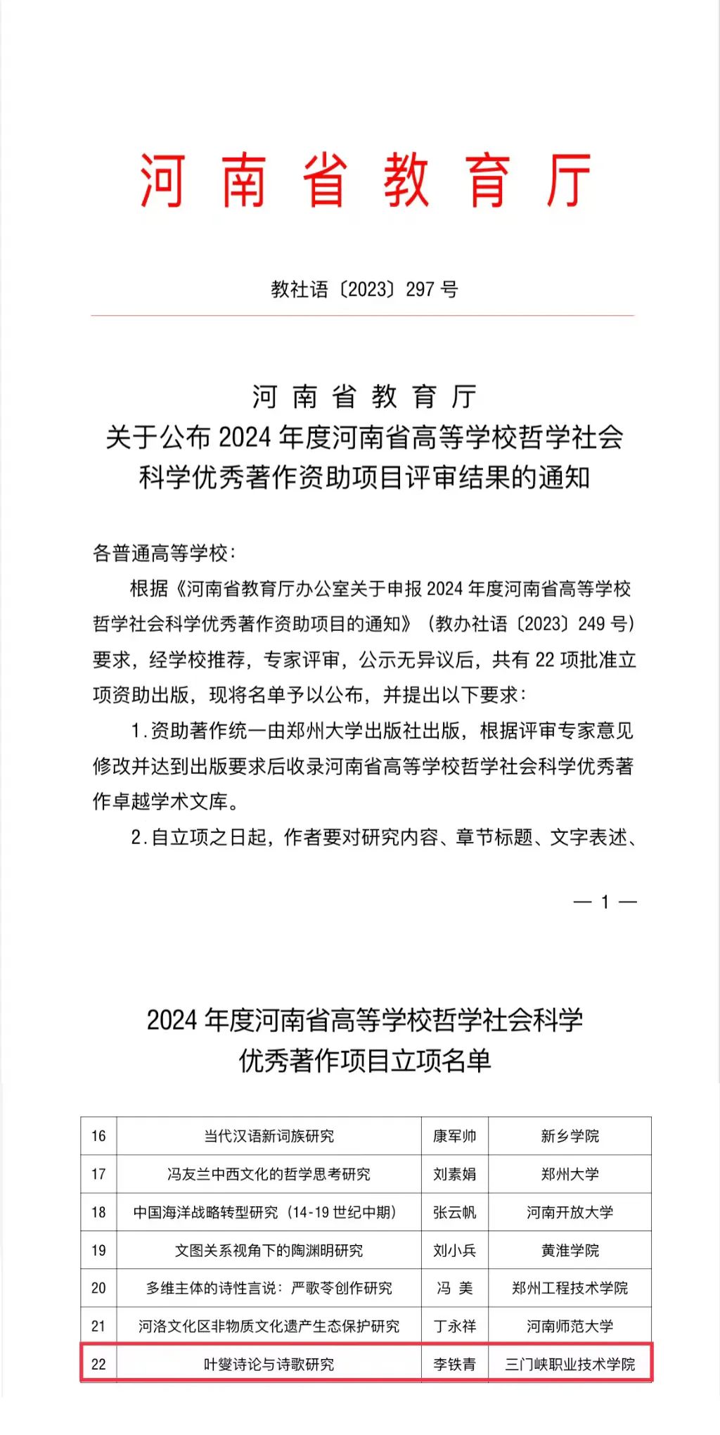 8月29日,河南省教育厅公布2024年度河南省高等学校哲学社会科学优秀著作资助项目立项名单,我校教师李铁青博士申报的项目《叶燮诗论与诗歌研究》榜上有名。本次资助的项目共22项,李铁青的项目是唯一的高职院校教师项目,展示了我校较强的科研实力。