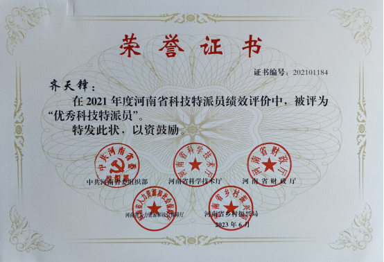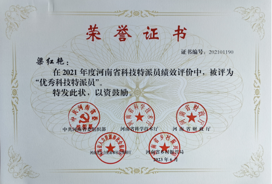 近日,中共河南省委组织部、河南省科学技术厅等5部门发布了《关于公布2021、2022年度河南省科技特派员绩效评价结果的通知》(豫科〔2023〕67号),我院齐天锋教授、梁红艳教授被评为“2021年度河南省优秀科技特派员”,陈书明副教授被评为“2022年度河南省优秀科技特派员”。