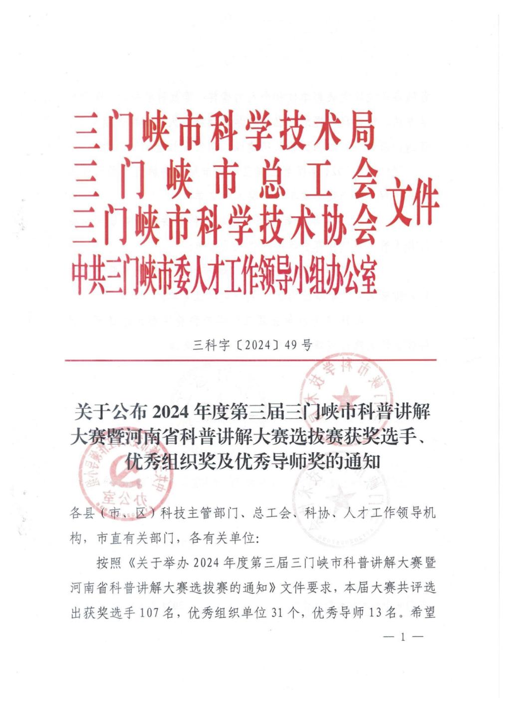 近日,第三届三门峡市科普讲解大赛暨河南省科普讲解大赛选拔赛活动获奖名单公布,我院获得优秀组织奖。