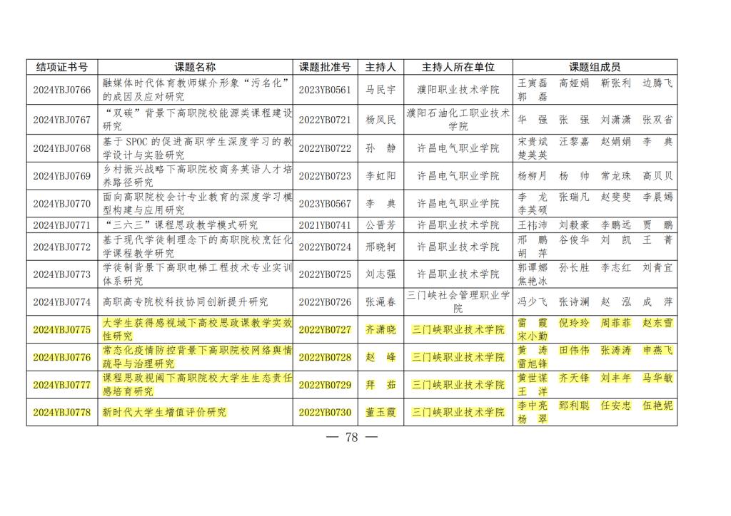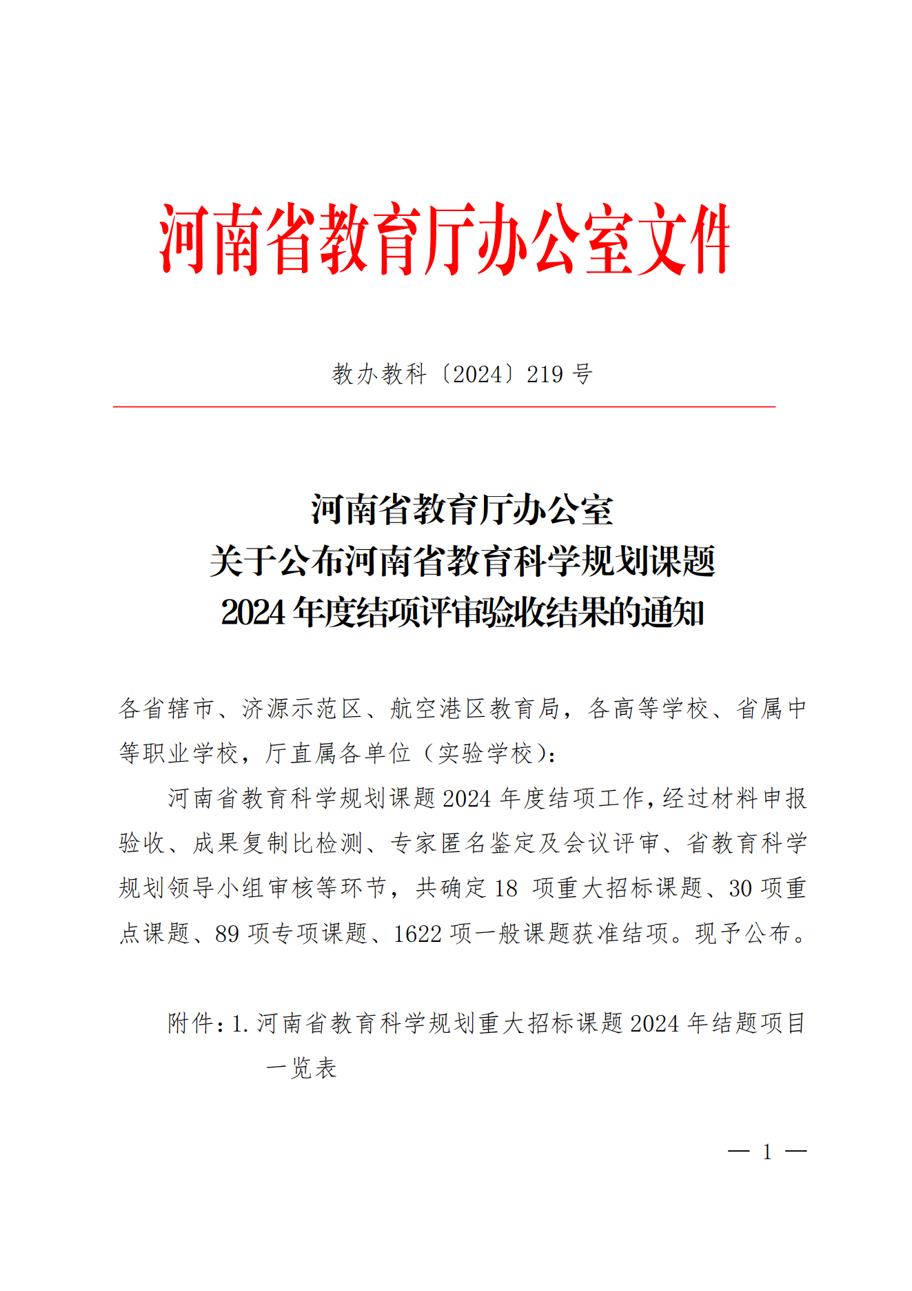 近日,河南省教育厅公布了河南省教育科学规划课题2024年度结项评审验收结果,根据《河南省教育厅关于公布河南省教育科学规划课题2024年度结项评审验收结果的通知》(教教科〔2024〕219号),经过材料申报验收、成果复制比检测、专家匿名鉴定及会议评审、省教育科学规划领导小组审核等环节,我院申报的5个省教育科学规划一般课题顺利结项。