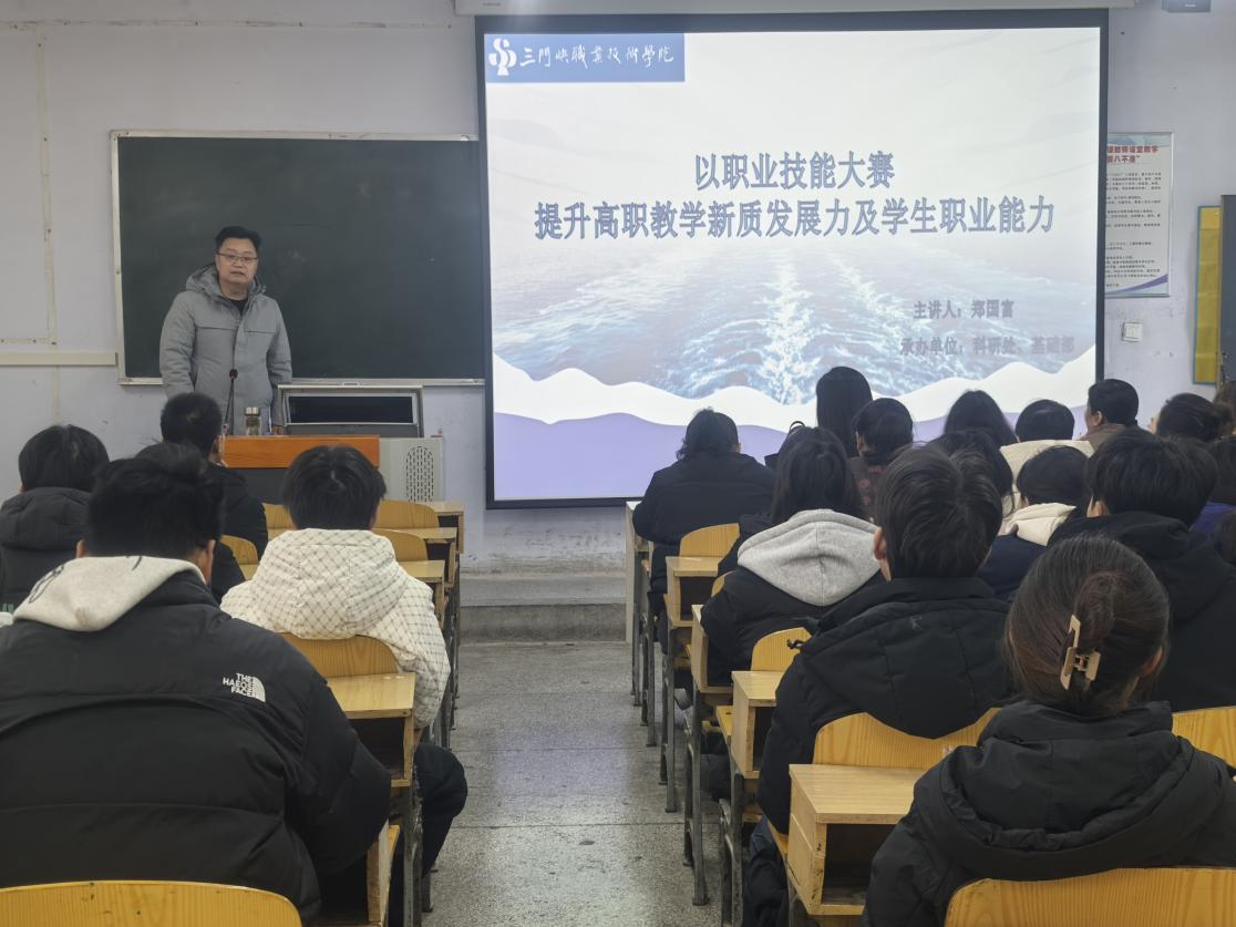 12月5日,基础部郑国富副教授作了《以职业技能大赛提升高职教学新质发展力及学生职业能力》专题讲座。郑国富结合丰富的教学经验和对职业技能大赛的深刻理解,对职业技能大赛的内涵、地位和功能进行了详细介绍,使大家对大赛有了更全面认识,并以《英语口语》赛项为例,详细解读了大赛的标准和要求,分享了备赛策略,强调了赛后反思与改进的重要性。