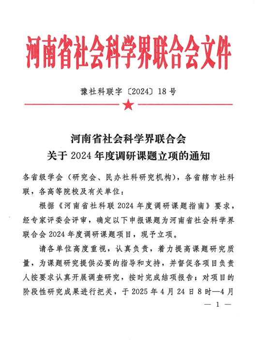 近日,河南省社会科学界联合会公布了2024年度调研课题立项名单,根据《河南省社会科学界联合会关于2024年度调研课题立项的通知》(豫社科联字〔2024〕18号),学院教师在2024年度的课题立项评审中有8项课题成功立项。