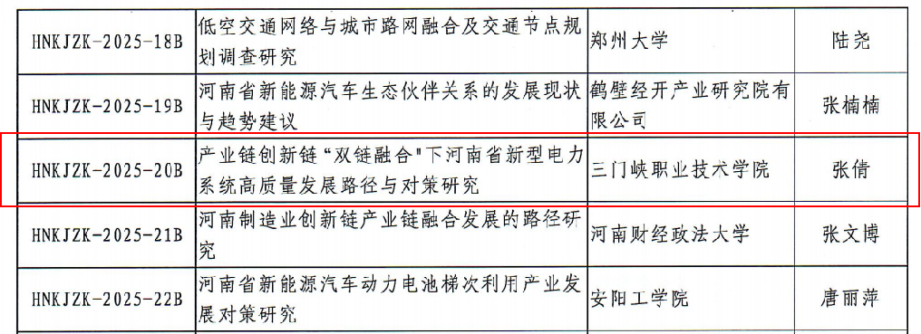 学院申报的《产业链创新链“双链融合”下河南省新型电力系统高质量发展路径与对策研究》课题,将立足河南省新型电力(新能源)装备重点产业链,围绕特高压及柔性直流输电装备、智能变配电及用电装备、风电及光伏装备、储能装备等重点领域展开深度调研,从产业链创新链“双链融合”角度出发,为加快推动河南省新型电力系统高质量发展提供科学决策依据。
