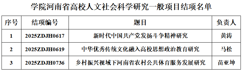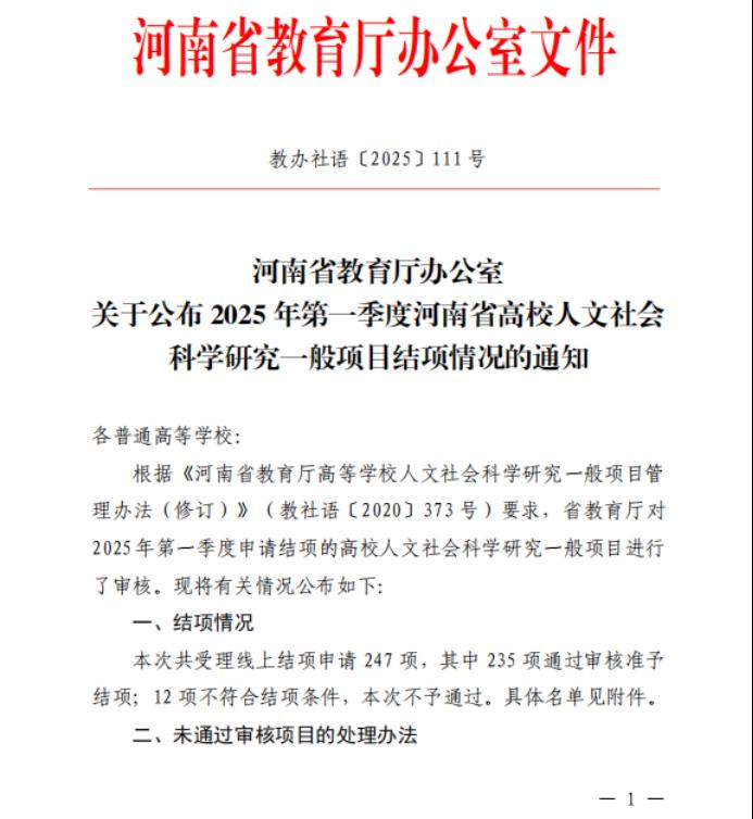根据《河南省教育厅办公室关于公布2025年第一季度河南省高校人文社会科学研究一般项目结项情况的通知》,学院共有3个项目获批结项。