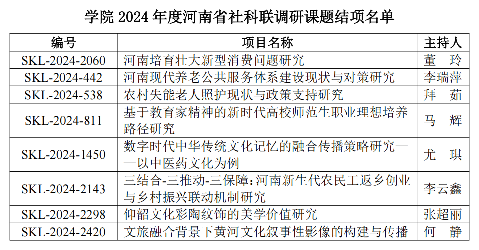 近日,从河南省社会科学界联合会传来喜讯,学院在2024年度调研课题结项评审和2025年调研课题立项评审中收获颇丰。以“8项结项+12项立项”的成绩,彰显了学院在社科研究领域的扎实实力与创新活力。