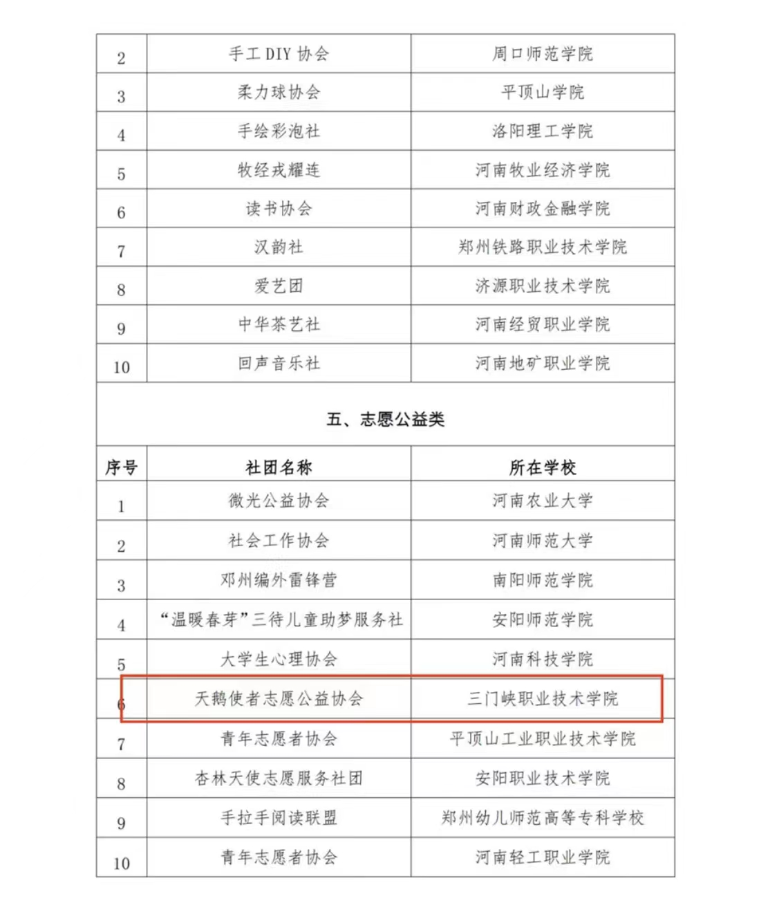 根据省委教育工委、省教育厅《关于开展2023年全省高校“十佳学生社团”评选的通知》(教思政函〔2023〕387号)要求,经学校推荐、专家评审等环节,评选出了六类十佳学生社团共60支。其中我校天鹅使者志愿公益协会入选全省高校志愿公益类“十佳学生社团”。
