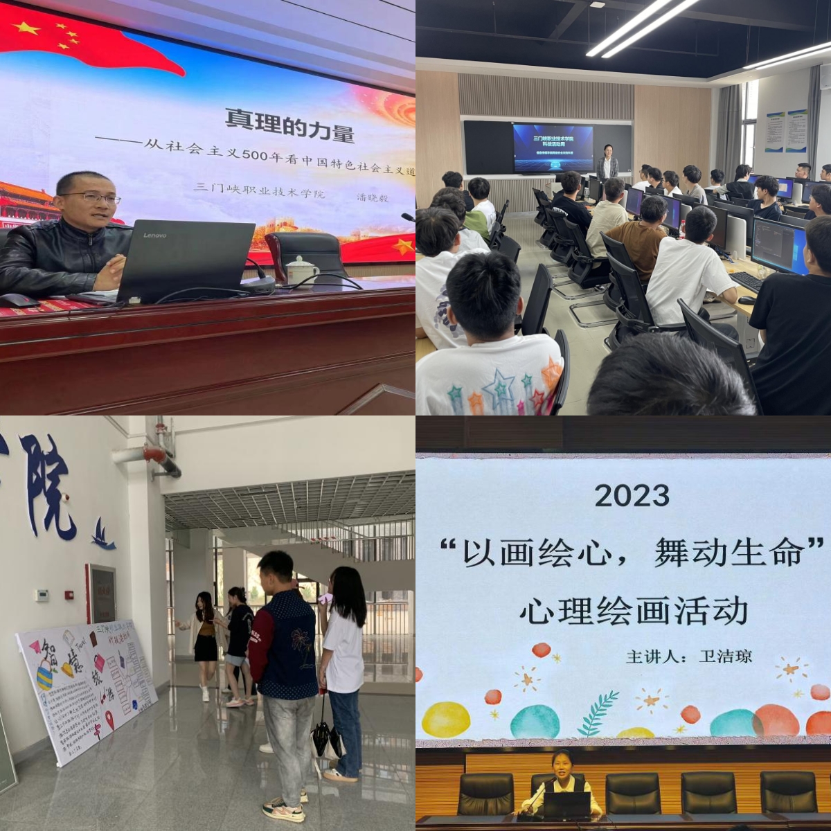 二是开放科普基地,弘扬科学家精神。我院图书馆与心理研究所两个三门峡市科普基地面向公众开放,举办专题活动。图书馆布置了“保护黄河生态共筑美好家园”科技周图书展,并利用宣传版面向读者介绍如何利用图书馆数字资源查询阅读黄河生态主题的科技图书。开展了4次“科技引领未来”为主题的科技活动周阅读活动,开展了非遗剪纸小课堂活动,特别邀请我市非遗剪纸传承人李竹梅带领大家体验剪纸艺术,感知传统文化。心理研究所分别举办了“和谐关系,绽放生命”的心理影片赏析活动与“以画绘心,舞动生命”的心理绘画活动,诠释心理健康理念,普及心理健康知识,助力大学生以理性平和、积极阳光的健康心态面对生活。