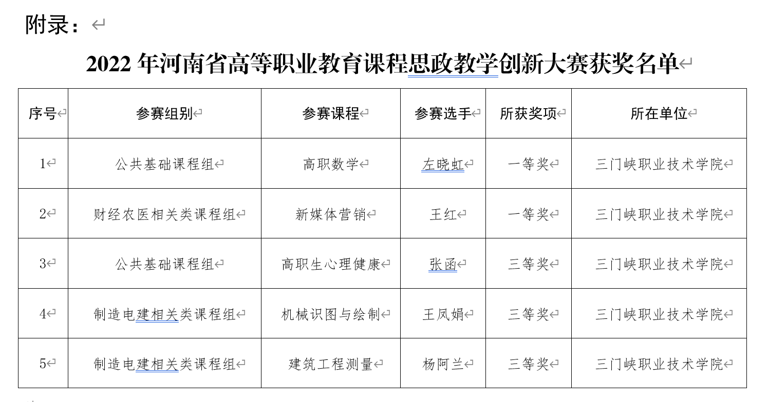 近日,河南省教育厅印发《关于公布2022年河南省高等职业教育课程思政教学创新大赛获奖名单的通知》(教办职成〔2023191号),我院获得河南省一等奖2项、三等奖3项的好成绩。