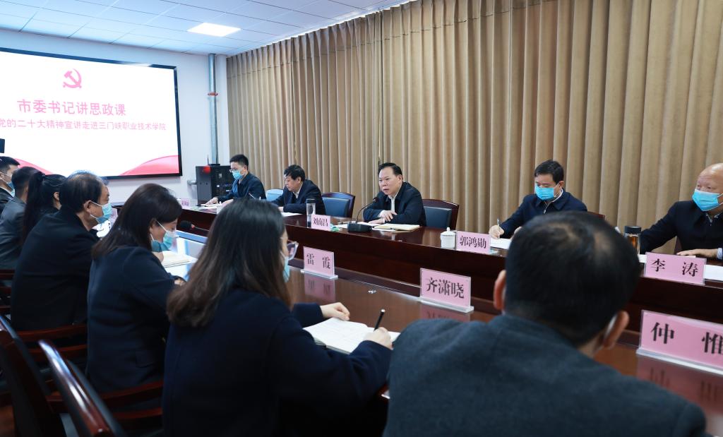 颉潭成表示:学院将坚决把学习宣传贯彻党的二十大精神作为当前和今后一个时期的首要政治任务,全面贯彻党的二十大作出的各项决策部署,认真落实刘南昌书记的宣讲要求,更好地用党的二十大精神统一思想、统一意志、统一行动,让党的二十大精神在三职院深入人心、落地生根。颉潭成强调,一要精心部署、全面发动,迅速兴起学习热潮;二要认真学习、加强研究,深刻领会核心要义;三要全面贯彻、扎实推进,坚决扛起使命担当,特别是要紧扣我市产业发展和社会需要,强化产教融合、校企合作,培育更多创新型高素质技术技能人才,为三门峡创新发展新局面做出应有的贡献。