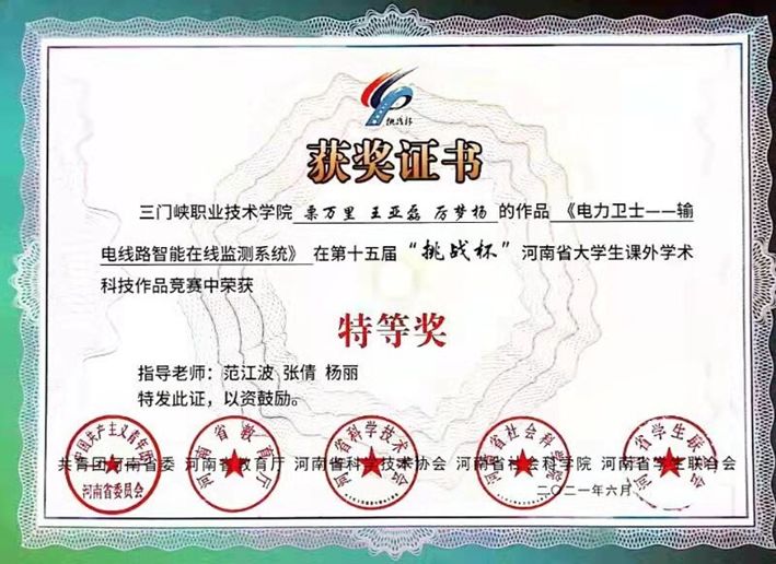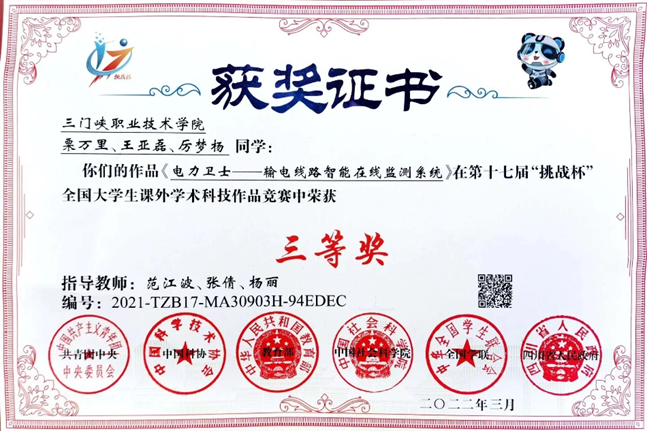 智能制造学院工科特色鲜明,在学院领导和支持下,学院教师积极组建师生项目团队,开展技术研究创新,培养学生的工匠精神,带领学生多次在各大赛中取得优异的成绩,为学生未来走上工作岗位打下扎实的基础。2020年1月,在范江波、张倩、杨丽三位教师的指导下,智能制造学院19物联网专业栗万里成立项目团队,经过市场调查,项目设计目标确立,创新开展技术研究,针对输电线路在线监测的关键技术进行分析和试验,并对使用的监测传感器进行多次选型测试,搭建输电线路智能在线监测系统模型,建立数据监测与分析云平台,三位指导教师带领团队学生克服重重困难,完成了输电线路智能在线监测系统的设计与制作,为输电线路智能化改造提供优质方案。
