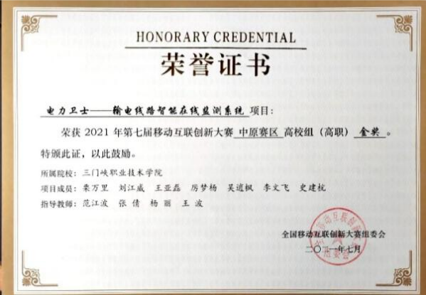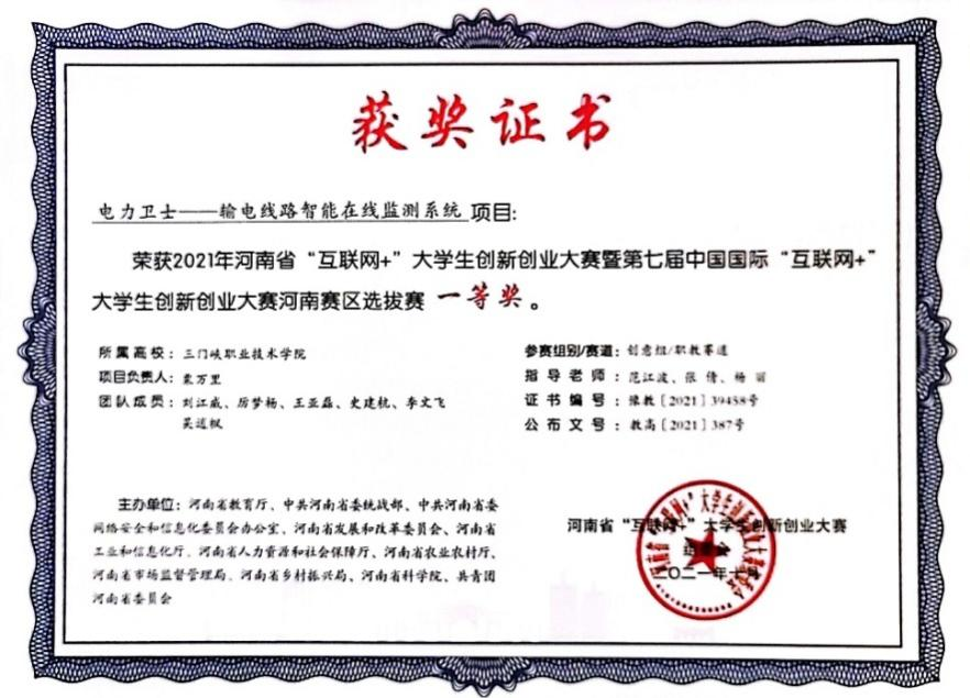 在团队创新创业路上,智能制造学院全力以赴做好服务保障,为学生项目团队提供技术支撑和研发设备投入,为大赛项目制作提供人员服务与经费保障、为学生课程提供政策激励与学习保障,使他们全身心投入到大赛中去,在2021年参加全国移动互联创新大赛,通过校赛、省赛,最终晋级国赛,一路过关斩将,最终获国赛一等奖。在2021年河南省“互联网+”大学生创新创业大赛中荣获一等奖。