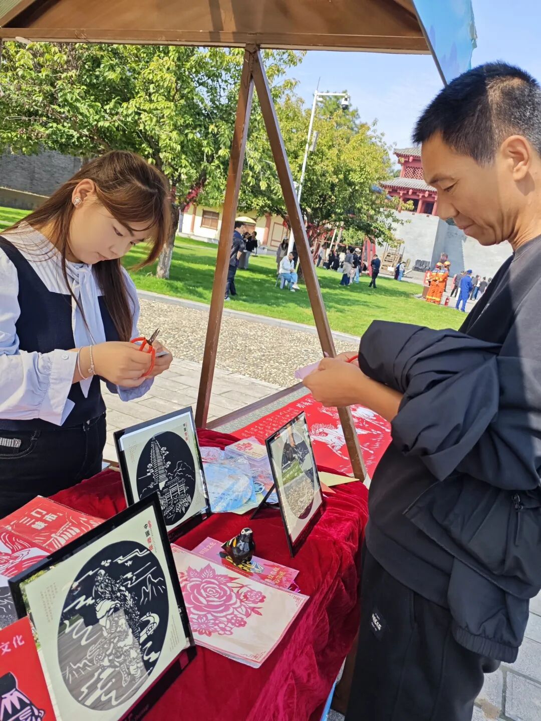 活动现场,师范学院剪纸社打造的“非遗市集·剪纸”专属展位,成为景区最具人气的打卡地。摊位上,学员们的剪纸作品题材丰富、特色鲜明:既有以函谷关城楼、古道为原型的写实之作,将景区厚重的历史人文风貌定格于红纸之上;也有“福”“寿”字样搭配吉祥纹样的传统剪纸,传递出满满的美好寓意。