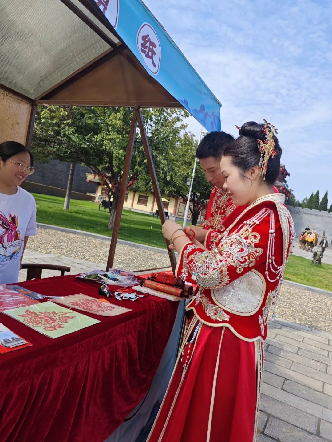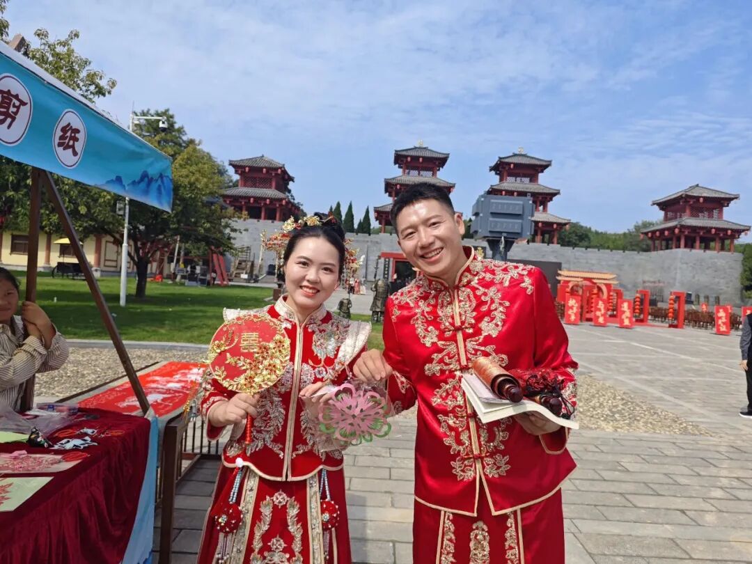 活动中,一对身着汉服的新人被剪纸展位吸引,师生主动送上“双喜”剪纸祝福。新人手持桃花剪纸合影,传统婚俗与非遗技艺巧妙融合、相得益彰,既为新人的函谷关之旅增添了独特的文化记忆,也展现了剪纸艺术在民俗婚礼中的鲜活生命力,让千年非遗真正走进现代人的日常生活。