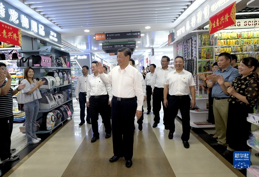 随后,习近平来到义乌国际商贸城考察。他通过电子屏幕实时了解商贸城运营及“义新欧”班列运行情况,并走进市场同商户、小企业主代表亲切交流,详细询问市场行情。他强调,义乌小商品闯出了大市场、做成了大产业,走到这一步很了不起,每个人都是参与者、建设者、贡献者。商贸城要再创新辉煌,为拓展国内国际市场、畅通国内国际双循环作出更大贡献。