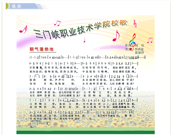 我院的校歌是一首热情洋溢催人奋进的歌曲,歌曲处情于景,托物言志,其势雄浑,撼人心魄,不仅具有时代精神,而且具有浓厚的人文情怀。歌曲情真意切,抒发了莘莘学子分发向上的豪情壮志。曲调激昂豪迈,热情奔放,充满了青春的气息,是一首具有自身特点的校歌。